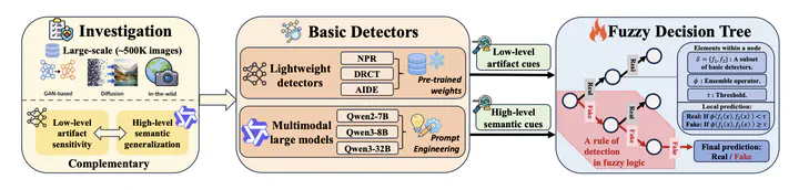 The malicious use and widespread dissemination of AI-generated images pose a serious threat to the authenticity of digital content. Existing detection methods exploit low-level artifacts left by common manipulation steps within the generation pipeline, but they often lack generalization due to model-specific overfitting. Recently, researchers have resorted to Multimodal Large Language Models (MLLMs) for AIGC detection, leveraging their high-level semantic reasoning and broad generalization capabilities. While promising, MLLMs lack the fine-grained perceptual sensitivity to subtle generation artifacts, making them inadequate as standalone detectors. To address this issue, we propose a novel AI-generated image detection framework that synergistically integrates lightweight artifact-aware detectors with MLLMs via a fuzzy decision tree. The decision tree treats the outputs of basic detectors as fuzzy membership values, enabling adaptive fusion of complementary cues from semantic and perceptual perspectives. Extensive experiments demonstrate that the proposed method achieves state-of-the-art accuracy and strong generalization across diverse generative models.